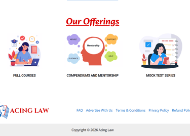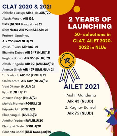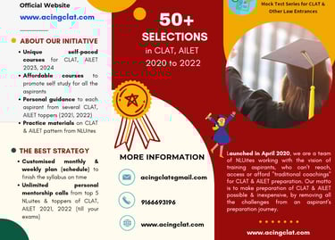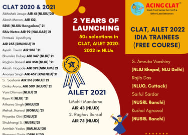 2019 - 2023 | Acing CLAT was an online platform for all the law aspirants who wanted to ace the CLAT and other law entrances. It provided them with mock tests, monthly compendiums and personalized mentorship from the CLAT toppers, studying in various National Law Universities.