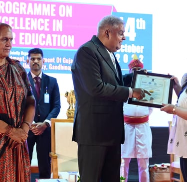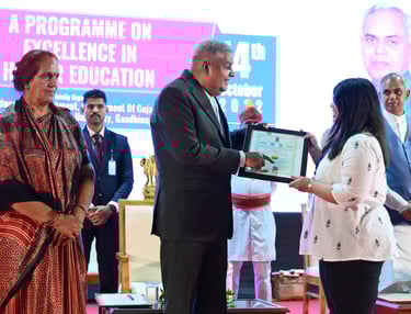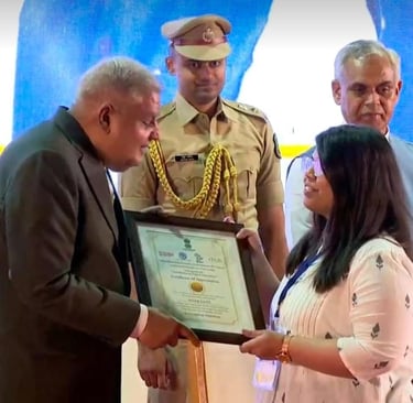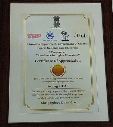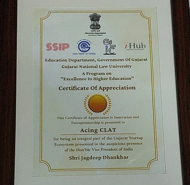 On 14th October 2022, Divisha Agarwal got felicitated by the HON'BLE VICE PRESIDENT OF INDIA, Shri Jagdeep Dhankhar, for her start up called ACING CLAT, for being an Integral part of the Gujarat Startup Ecosystem through its Innovation and Entrepreneurship.